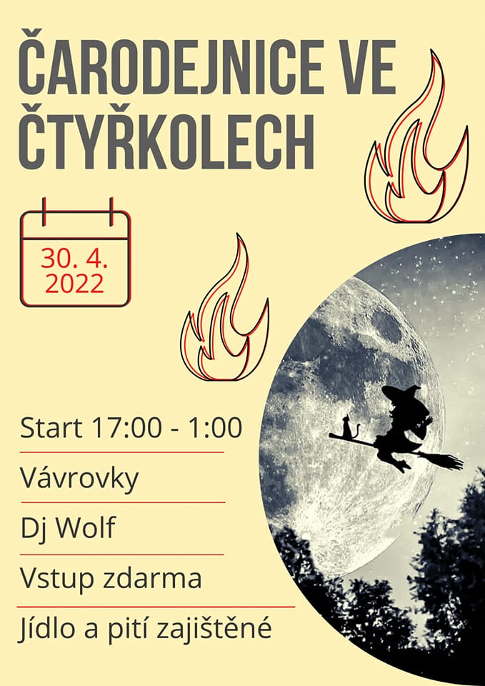 Čarodějnice ve Čtyřkolech odstartují 30.4. v 17h na bývalém fotbalovém hřišti ve Vávrovkách (Letní scéna). Bude občerstvení, hudba DJ Wolf.