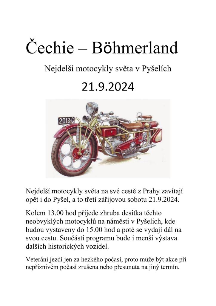 Nejdelší motocykly světa na své cestě z Prahy zavítají opět i do Pyšel, a to v sobotu 21.9. kolem 13 hodin. Přijede zhruba desítka těchto neobvyklých motocyklů na náměstí v Pyšelích, kde budou vystaveny do 15 hodin.