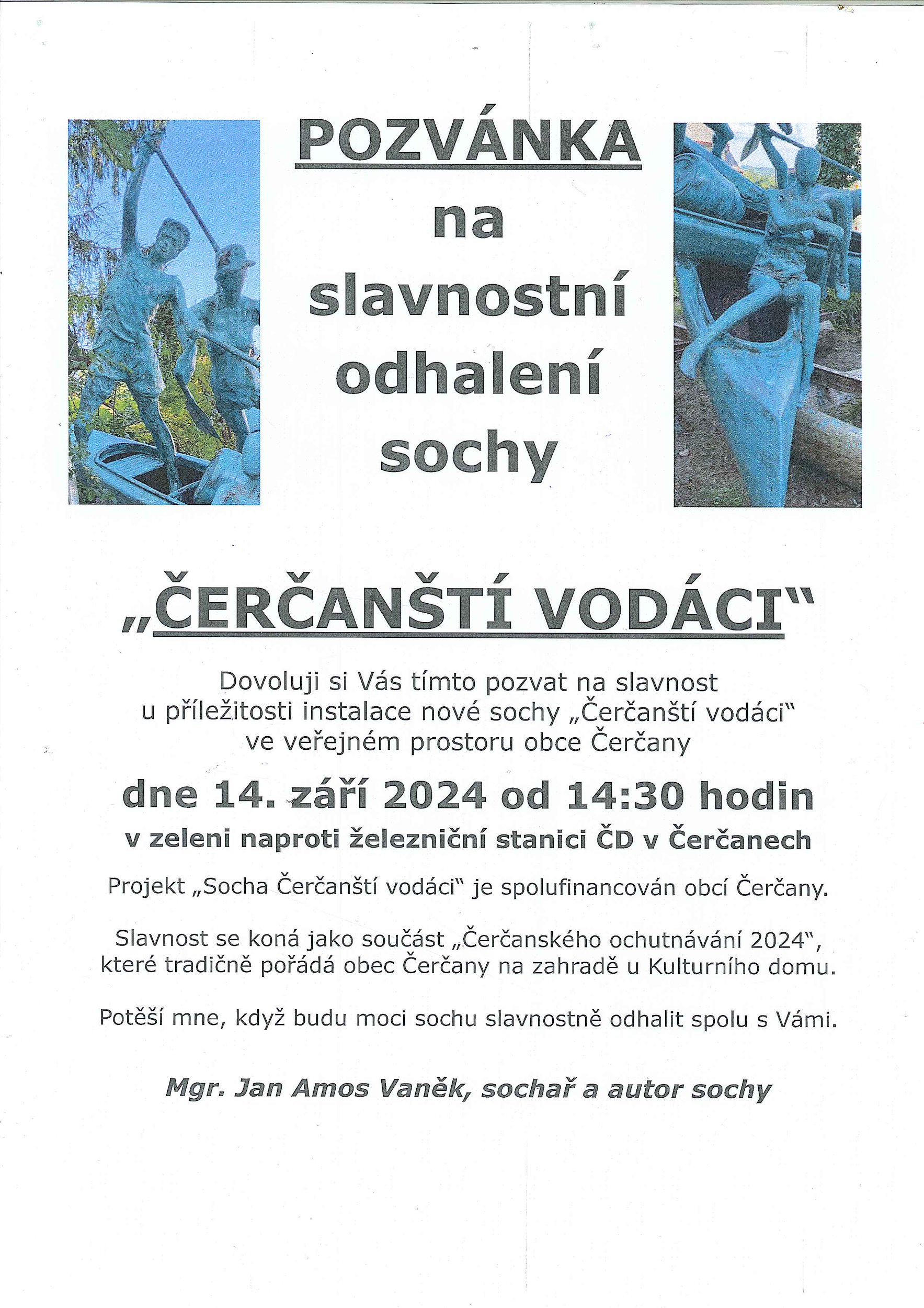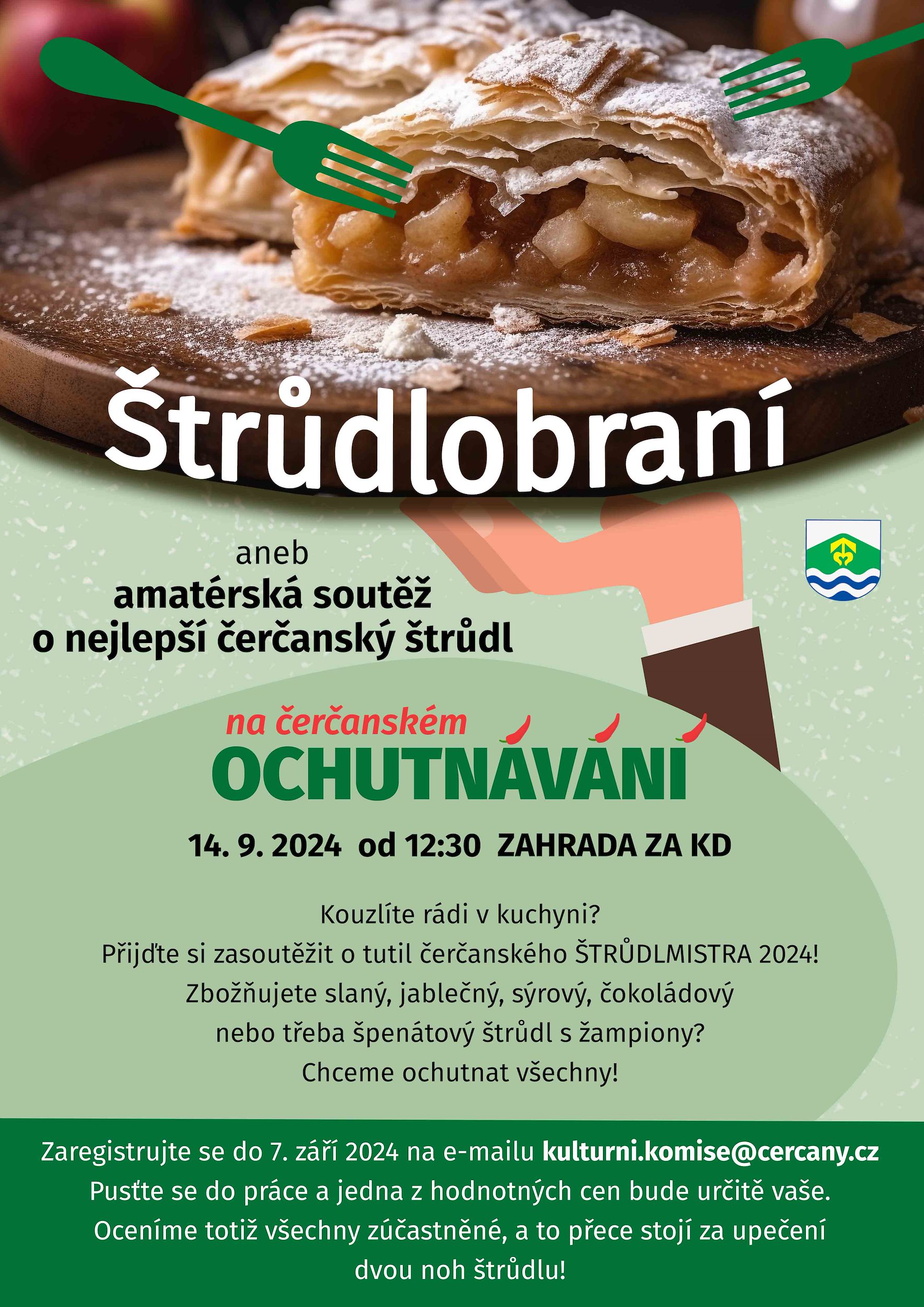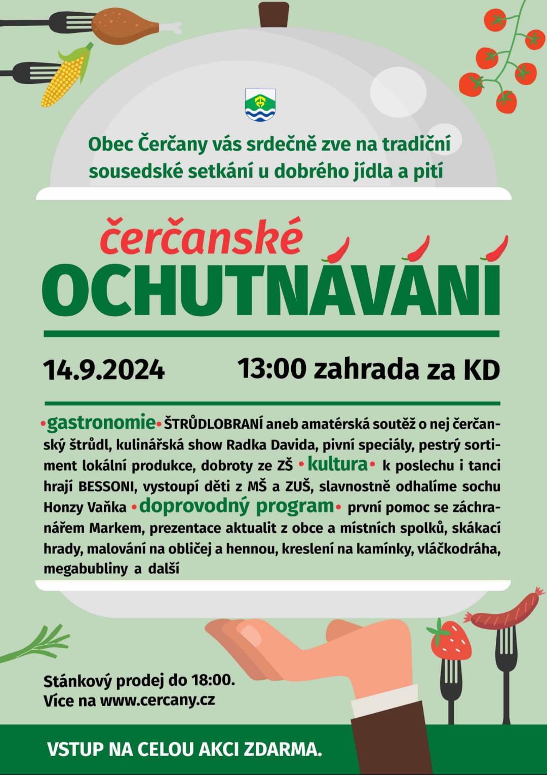 V sobotu 14.9. od 13 hodin proběhne v zahradě Kulturního domu v Čerčanech tradiční Ochutnávání s bohatým kulinářským i kulturním programem. Součástí je i soutěž o nej štrůdl nebo odhalení sochy Čerčanští vodáci před nádražím.