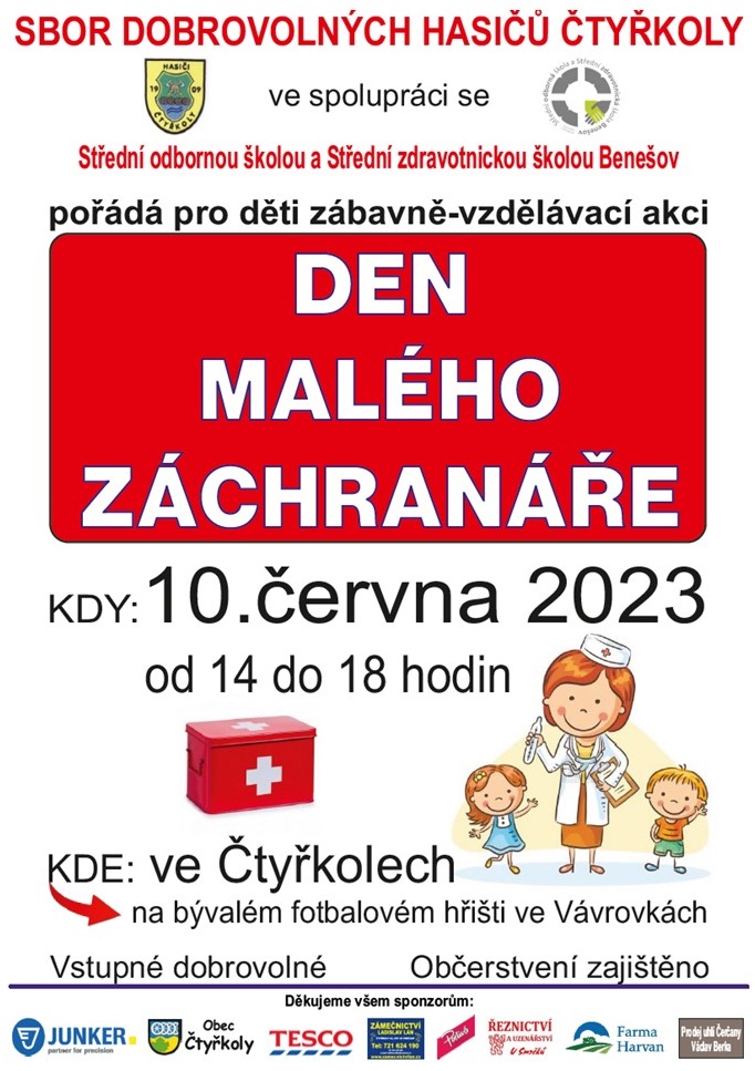 SDH Čtyřkoly ve spolupráci se Střední zdravotnickou školou v Benešově pořádají v sobotu 10.6. od 14 hodin na bývalém fotbalovém hřišti ve Vávrovkách zábavně vzdělávací akci pro děti Den malého záchranáře. Vstupné dobrovolné, občerstvení zajištěno.