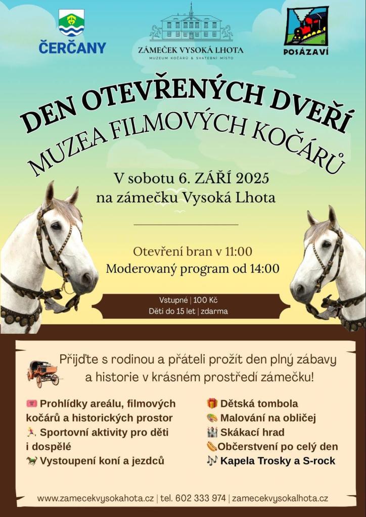Zámeček Vysoká Lhota v Čerčanech zve na den otevřených dveří v sobotu 6. září od 11 hodin. Na programu jsou i sportovní aktivity, vystoupení koní a jezdců, hudba, akce pro děti a občerstvení.