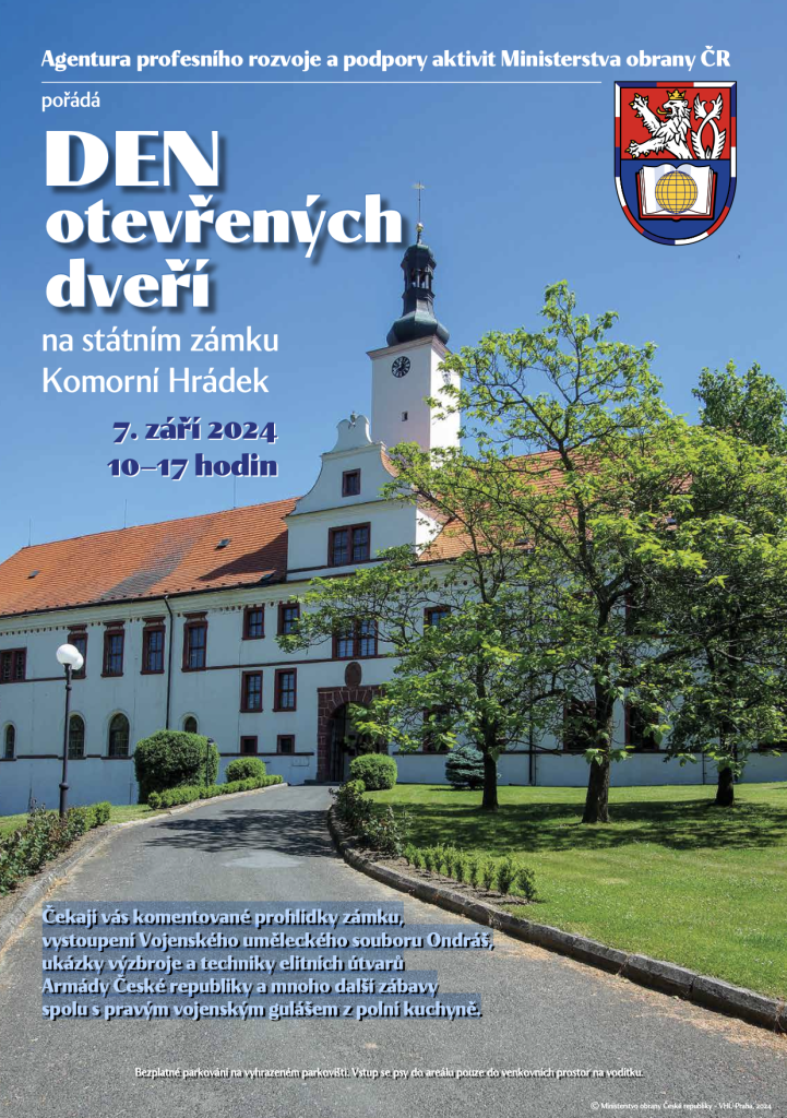 Ministerstvo obrany zve 7.9. na den otevřených dveří na zámku Komorní Hrádek. Čekají vás komentované prohlídky zámku, vystoupení Vojenského uměleckého souboru, ukázky výzbroje a techniky elitních útvarů Armády České republiky a mnoho další zábavy spolu s pravým vojenským gulášem z polní kuchyně.