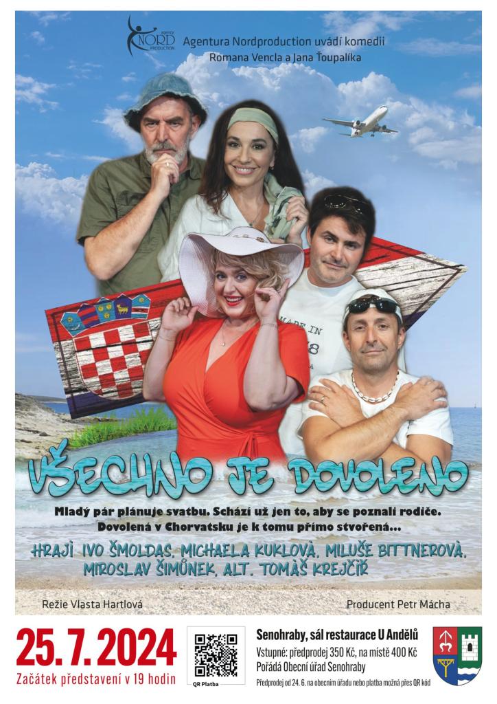 Divadelní představení - komedie Všechno je dovoleno proběhne 25.7. od 19 hodin v sále restaurace U Andělů. Předprodej přes QR kód nebo na OÚ Senohraby.