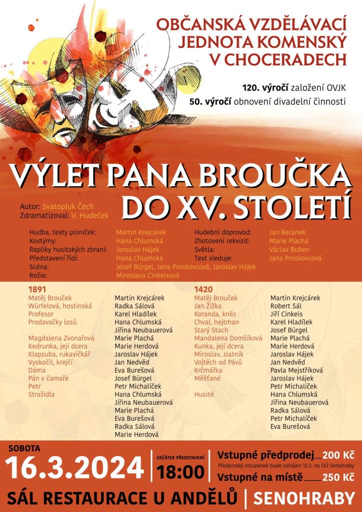 OBČANSKÁ VZDĚLÁVACÍ JEDNOTA KOMENSKÝ V CHOCERADECH zve do Senohrab na divadelní představení Výlet pana Broučka do XV. století. Představení se uskuteční v sobotu 16.3. od 18 hodin v sále restaurace U Andělů.