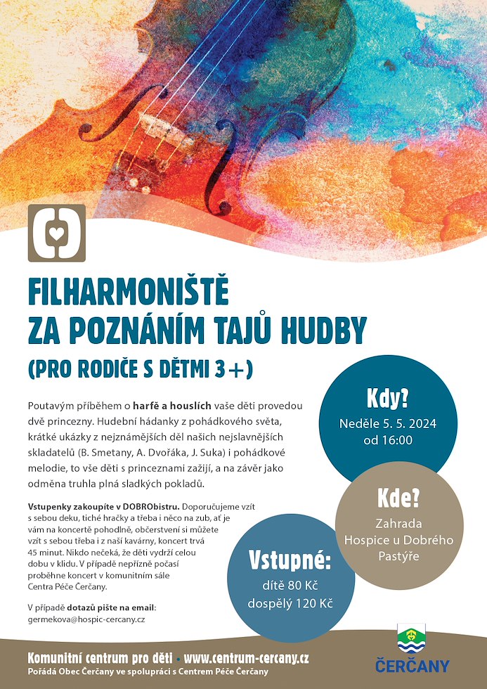 Centrum péče Čerčany pořádá v neděli 5.5. od 16h hudební akci pro rodiče s dětmi Filharmoniště - Za poznáním tajů hudby. Podrobnosti na plakátu.