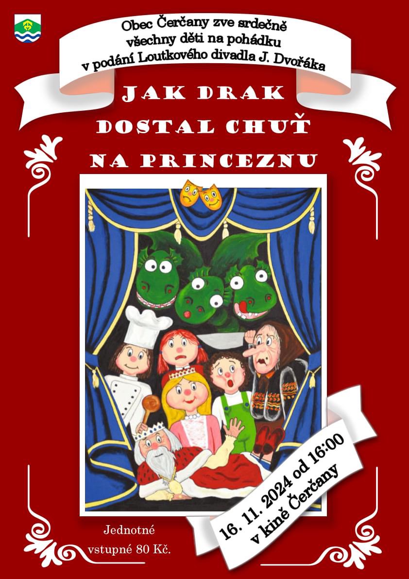 V sobotu 16.11. od 16 hodin zahraje v čerčanském kině Loutkové divadlo J. Dvořáka pohádku Jak drak dostal chuť na princeznu. Vstupné 80 Kč.