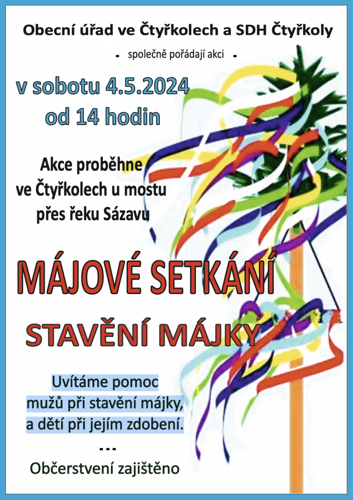 Obecní úřad a hasiči zvou na májové setkání spojené se stavěním májky v sobotu 4.5. od 14 hodin u mostu přes Sázavu. Uvítáme pomoc mužů při stavění májky, a dětí při jejím zdobení. Občerstvení zajištěno.