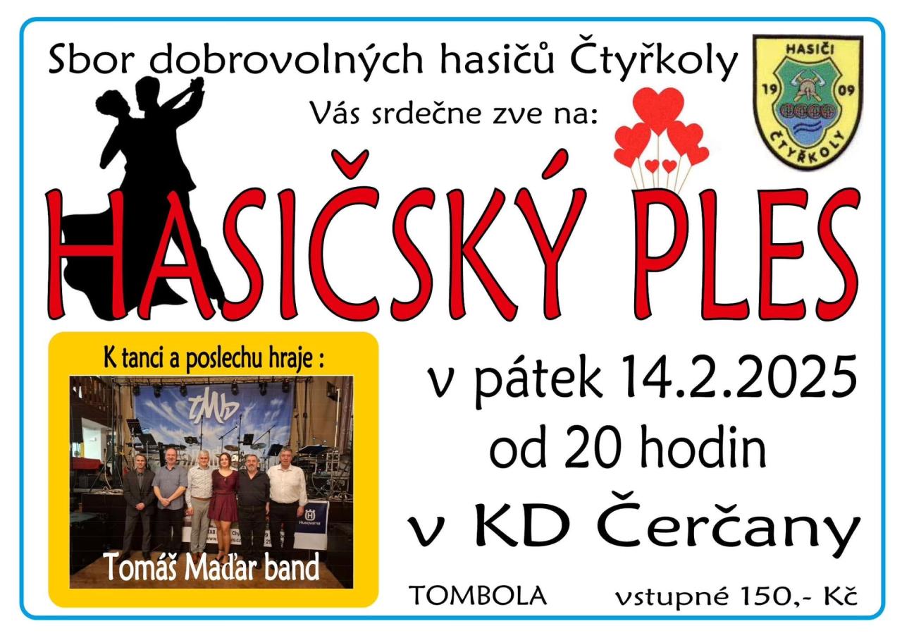 Sbor dobrovolných hasičů ve Čtyřkolech zve na Hasičský ples v pátek 14.2. od 20 hodin v Kulturním domě v Čerčanech. Hraje Tomáš Maďar Band.