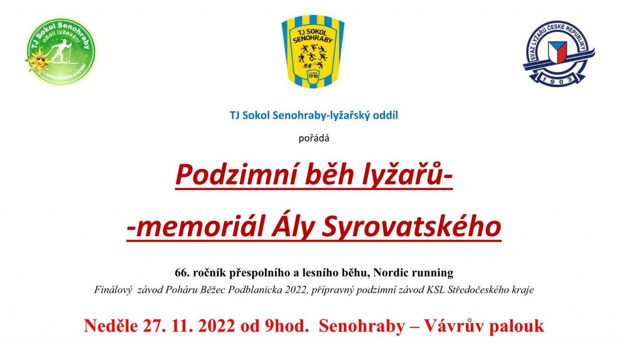 TJ Sokol Senohraby zve v neděli 27. listopadu na 66. ročník Podzimního běhu lyžařů - memoriál Ály Syrovatského. Akce startuje na Vávrově palouku v Senohrabech v 9 hodin. Propozice a přihlášky na www.sose.cz.
