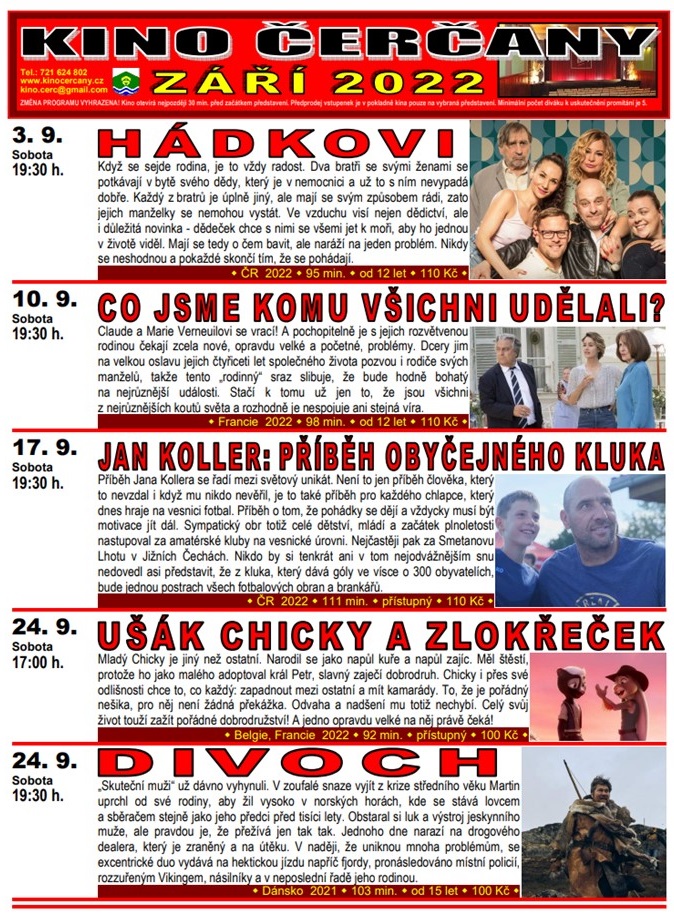 V příloze naleznete program kina v Čerčanech na září. Přijďte se podívat na zajímavé filmy a podpořit naše lokální kino.