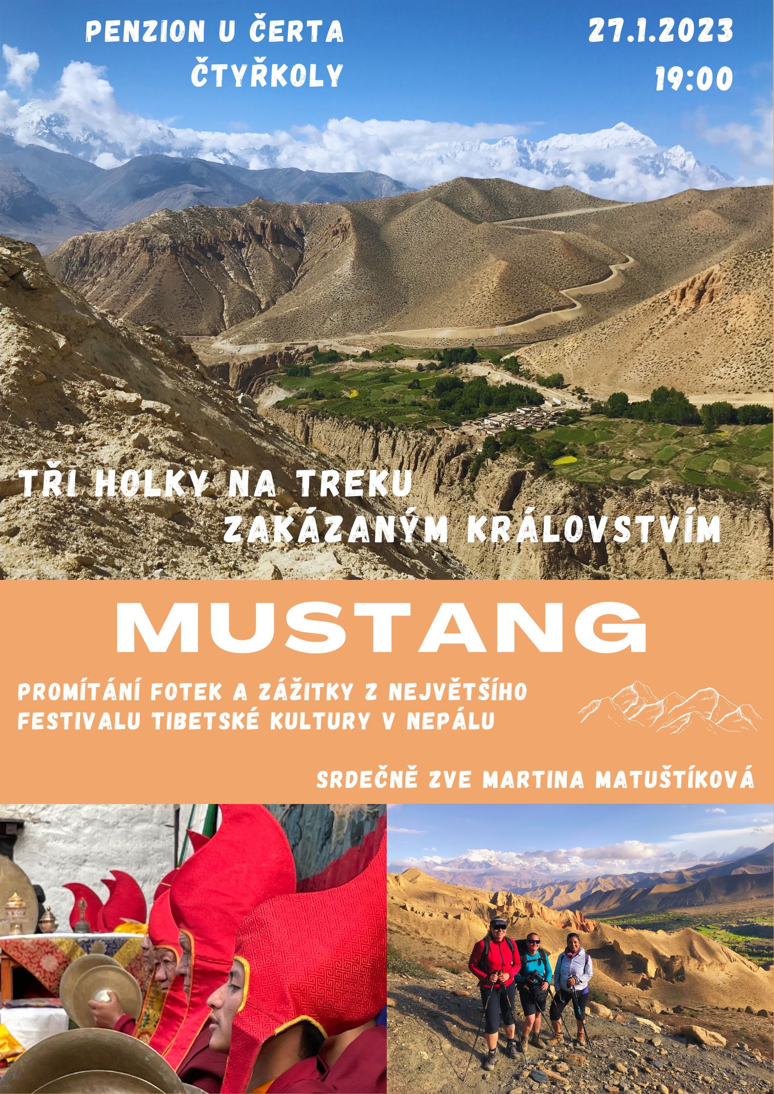 Martina Matuštíková zve 27.1. od 19 hodin do restautrace U Čerta ve Čtyřkolech na promítání a vyprávění o cestě do Nepálu do království Mustang na největší festival tibetské kultury v Nepálu.