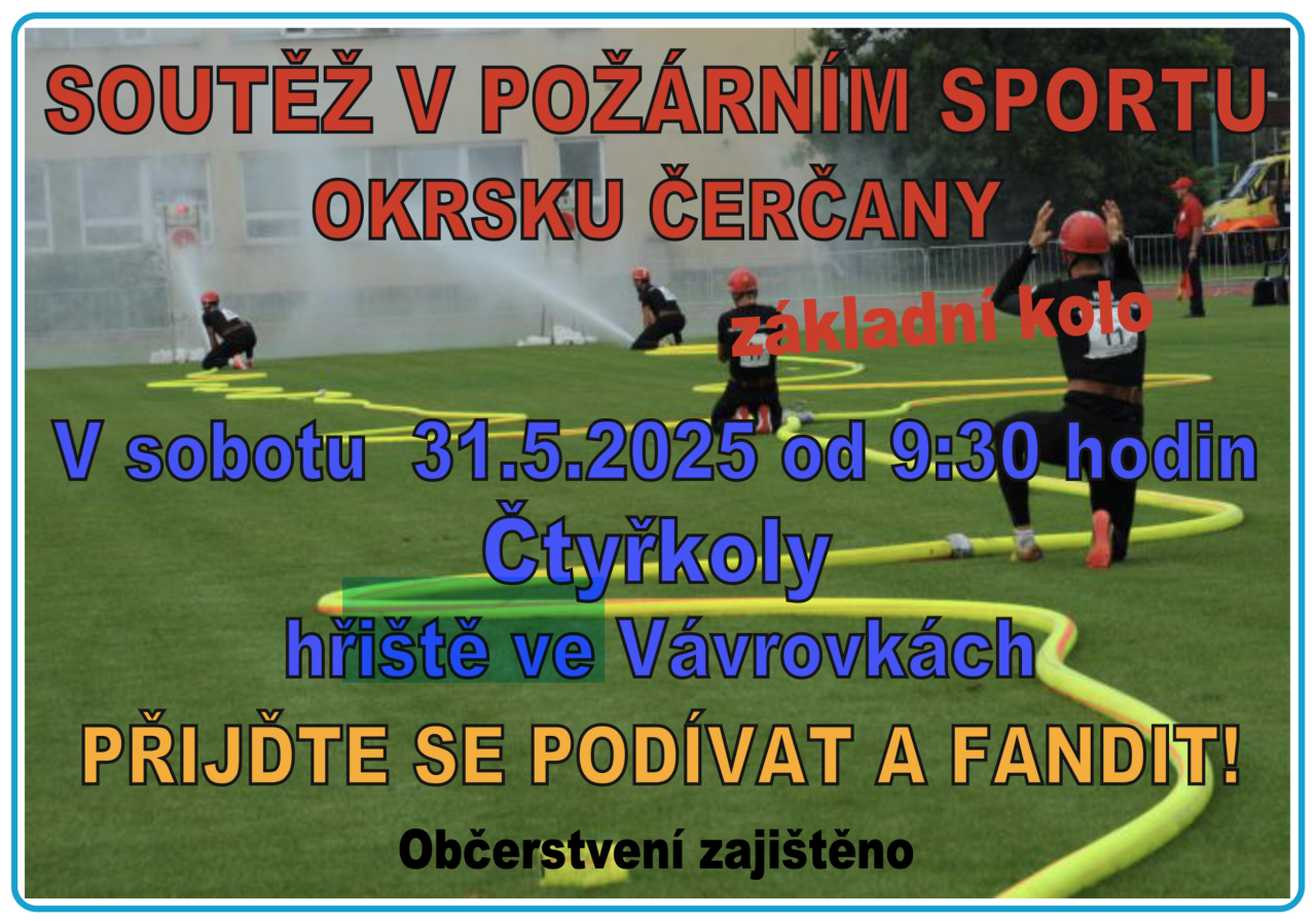 V sobotu 31.5. od 9:30 proběhne ve Čtyřkolech na bývalém hřišti ve Vávrovkách soutěž v požárním sportu okrsku Čerčany - základní kolo. Přijďte se podívat a zafandit, občerstvení zajištěno.