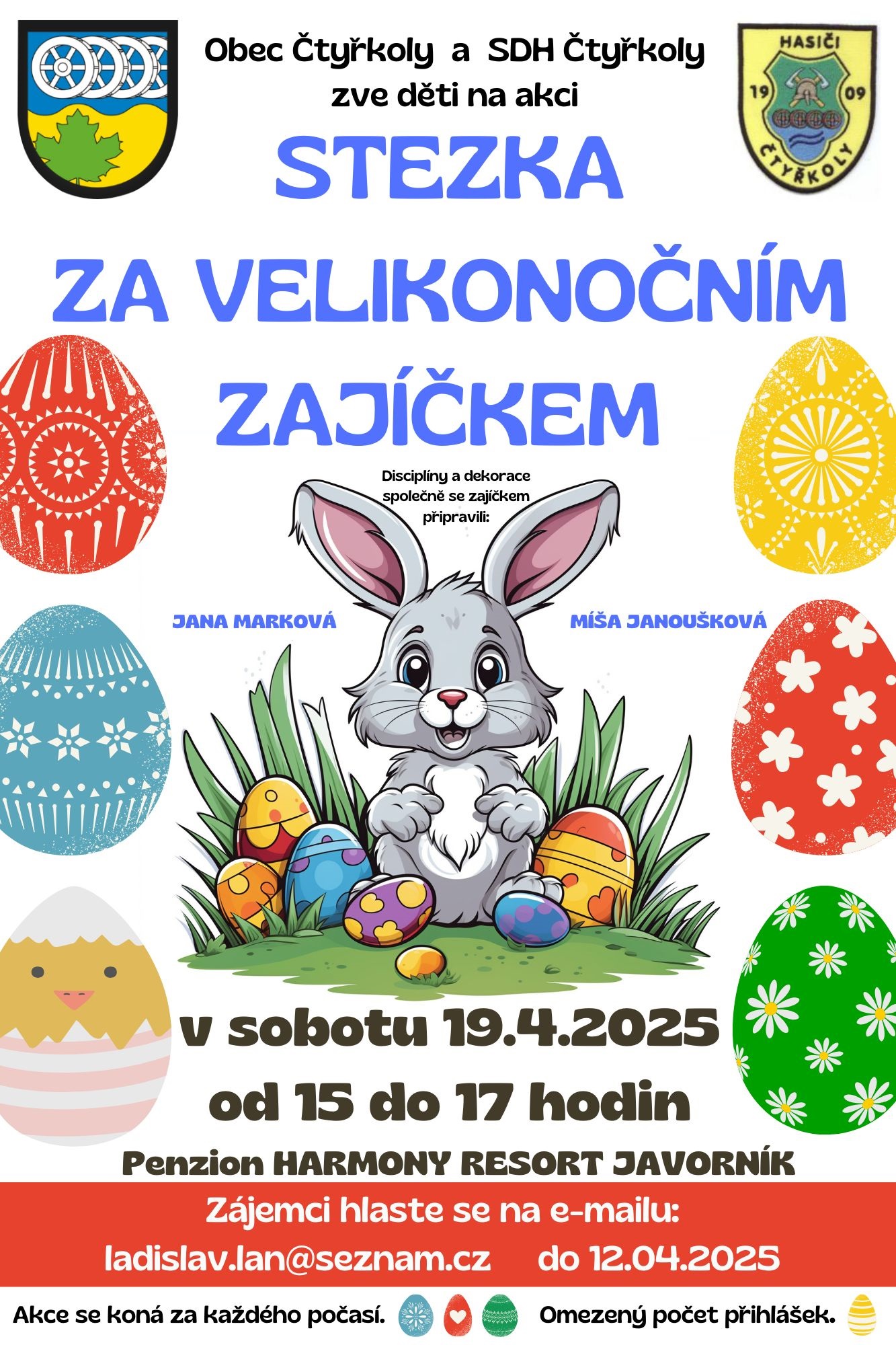 Obec Čtyřkoly a SDH Čtyřkoly zvou dēti na akci Stezka za Velikonočním zajíčkem. Akce se koná v sobotu 19.4. od 15 do 17 hodin v penzionu Harmony Resort Javorník. Zájemci hlaste se na e-mailu: ladislav.lan@seznam.cz do 12.04.2025.