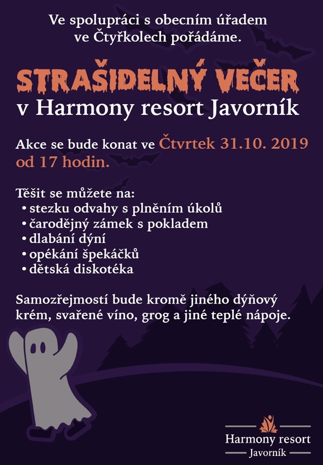 Harmony resort Javorník a OÚ Čtyřkoly zvou ve čtvrtek 31.10. od 17 hodin na Strašidelný večer spojený s hledáním pokladu a dalšími aktivitami - viz pozvánka.