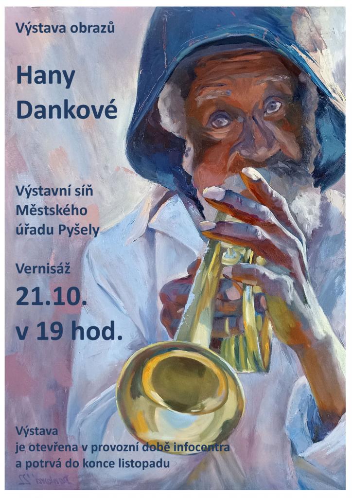 Vernisáž výstavy obrazů Hany Dankové se uskuteční v pátek 21.10. od 19 hodin ve výstavní síni v přízemí MěÚ v Pyšelích. Výstava potrvá do konce listopadu.